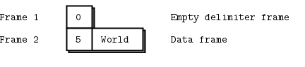 If you spy on the network data flowing between hwclient and hwserver, this is what you’ll see: every request and every reply is in fact two frames, an empty frame and then the body. It doesn’t seem to make much sense for a simple REQ-REP dialog. However you’ll see the reason when we explore how ROUTER and DEALER handle envelopes.