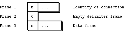 In the first case, the ROUTER simply reads all frames, including the artificial identity frame, and passes them on blindly. In the second case the ROUTER must know the format of the reply envelope it’s being sent. As the other peer is a REQ socket, the ROUTER gets the identity frame, an empty frame, and then the data frame.