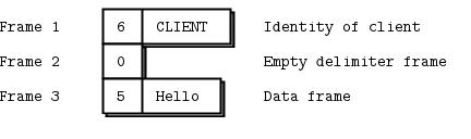 We’ll start by sending “Hello” through a REQ socket. The REQ socket creates the simplest possible reply envelope, which has no addresses, just an empty delimiter frame and the message frame containing the “Hello” string. This is a two-frame message.