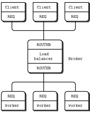 Now let’s extend the REQ-REP pair with a ROUTER-DEALER proxy in the middle and see how this affects the reply envelope. This is the extended request-reply pattern we already saw in Chapter 2 - Sockets and Patterns. We can, in fact, insert any number of proxy steps. The mechanics are the same.